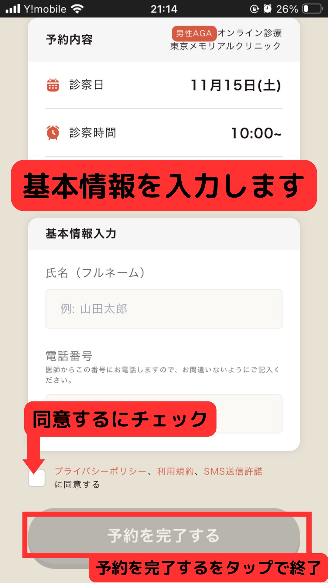 ④基本情報を入力→利用規約同意にチェック→『予約を完了する』をタップ。